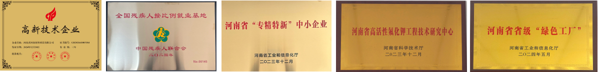 主导产品氟化钾,被中国技术监督协会授予“标准、质量、品牌,服务”信得过企业荣誉称号,多次被重要客户授予“质量信得过单位”;荣获“全国残疾人按比例就业基地”、“河南省专精特新中小企业”,“河南省工程技术研究中心”,“河南省智能应用场景”,“河南省省级绿色工厂”、市级“工业设计中心”,“纳税十大明星”、“安全生产先进单位”、“质量管理先进单位”、“信用建设先进单位”、“年度科技创新平台企业”等多种荣誉;在第二届亚细安化学工业科技成果博览会上“工业无水氟化钾(高活性)”荣获金奖。