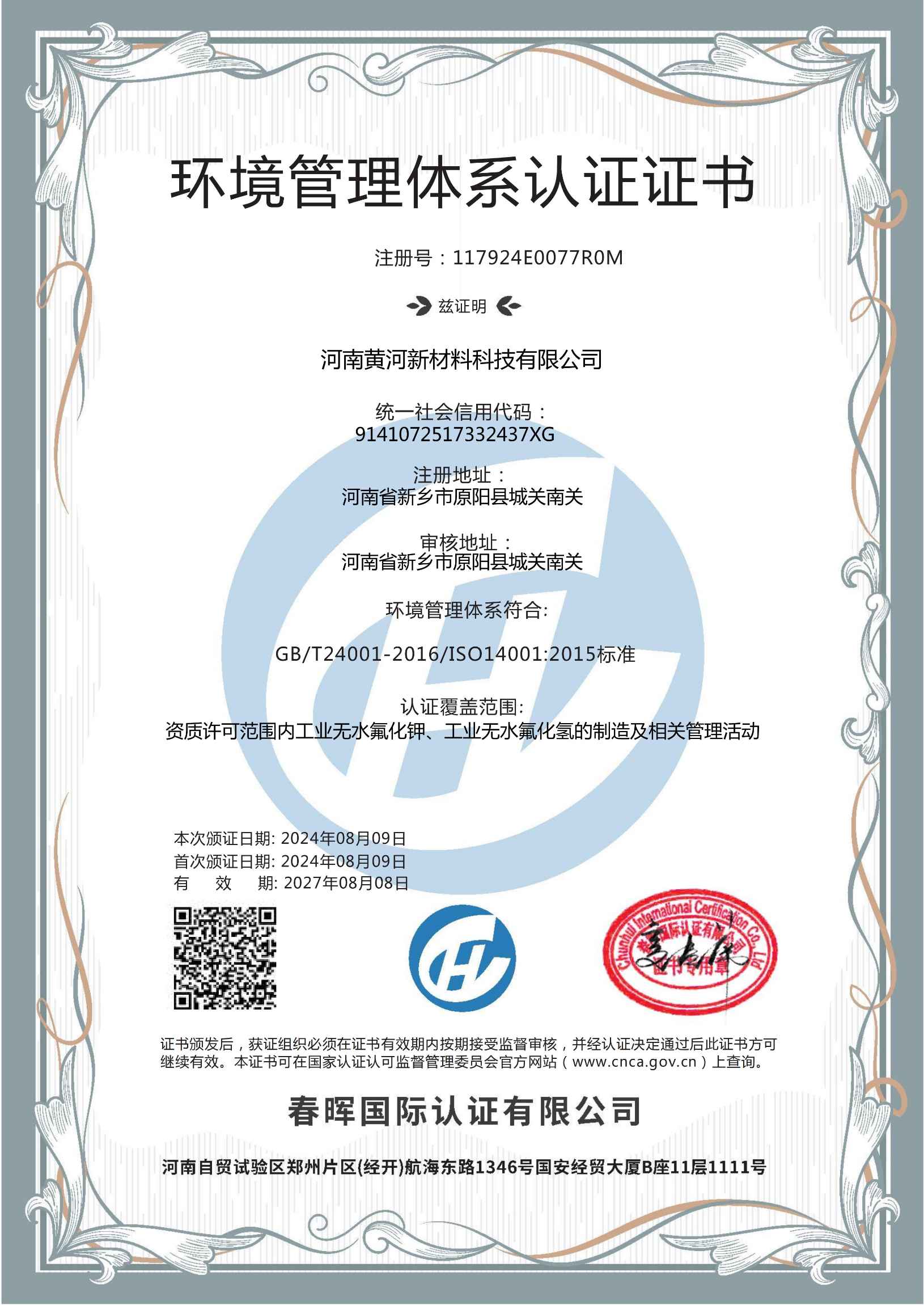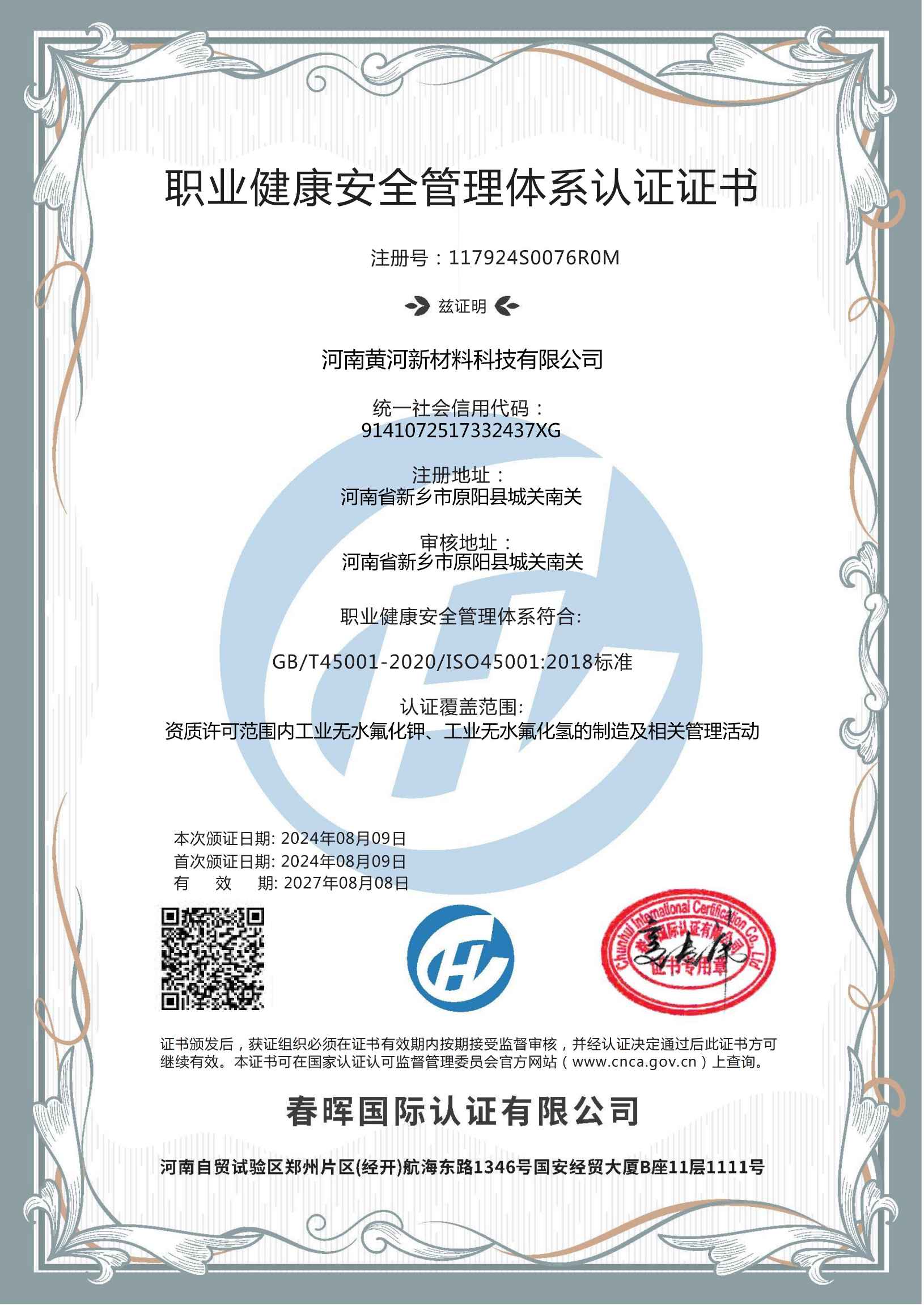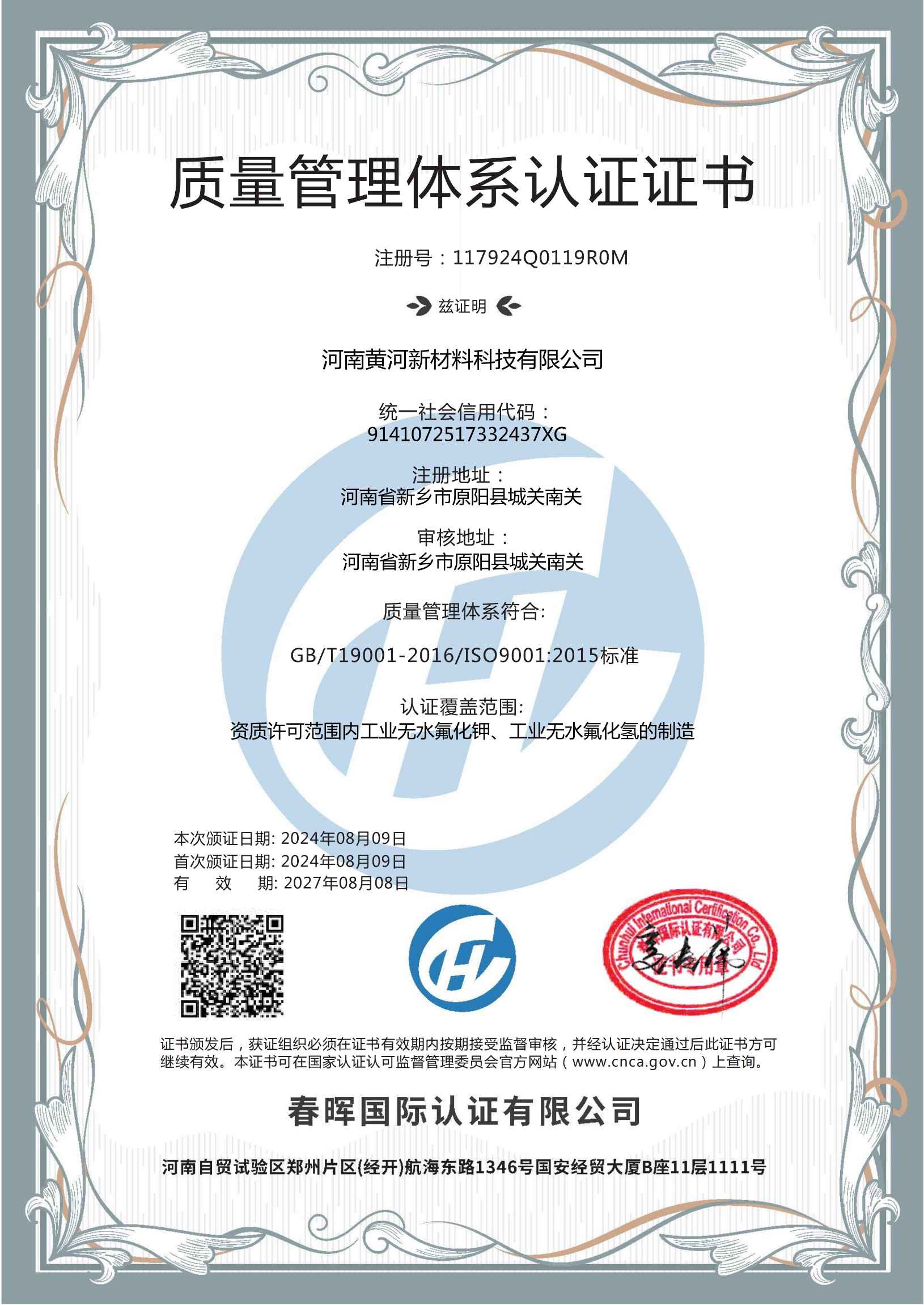 作为全球较大的氟化钾生产企业,黄河新材料公司是工业无水氟化钾行业标准HB/T2829-2008的主要起草单位。2007年6月,公司通过了国际ISO90001质量管理体系认证、IS14001:2004环境管理体系认证、IS018001:2007职业健康安全管理体系认证,公司产品广销全国各地,并远销中南美、北美、欧洲、日韩、东南亚等二十多个国家和地区。按照“以人为本、科技兴企、产业报国”的经营理念,辐射周边,回报国家,努力奋进,勇于拼搏,创造良好的经济效益和社会效益。